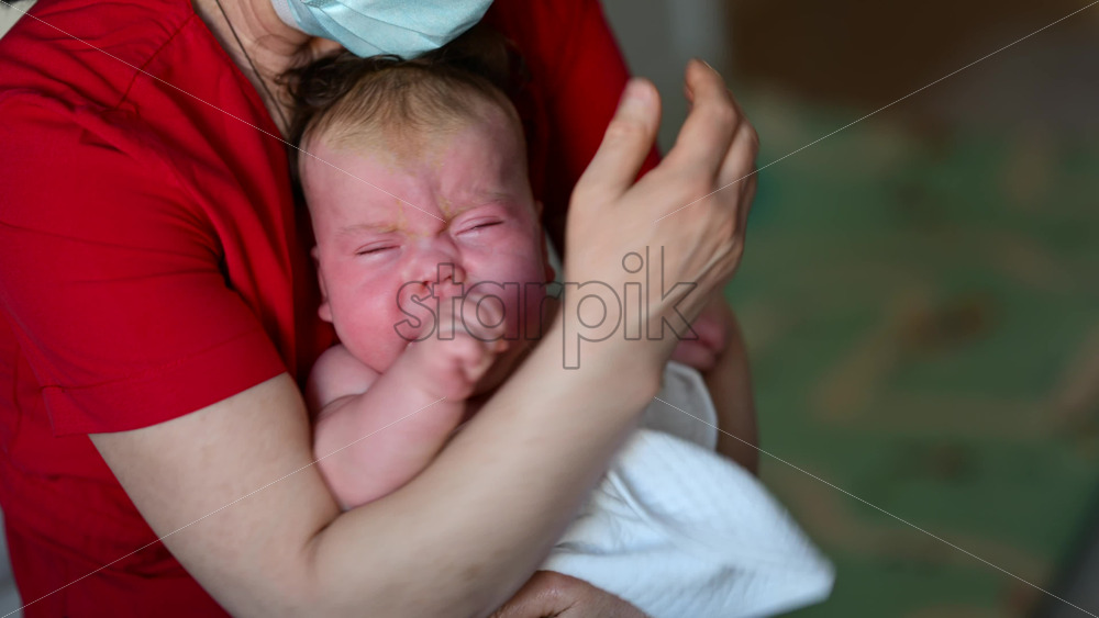 Caregiver supporting a baby upright while holding their hands. Early development and physical support during infancy