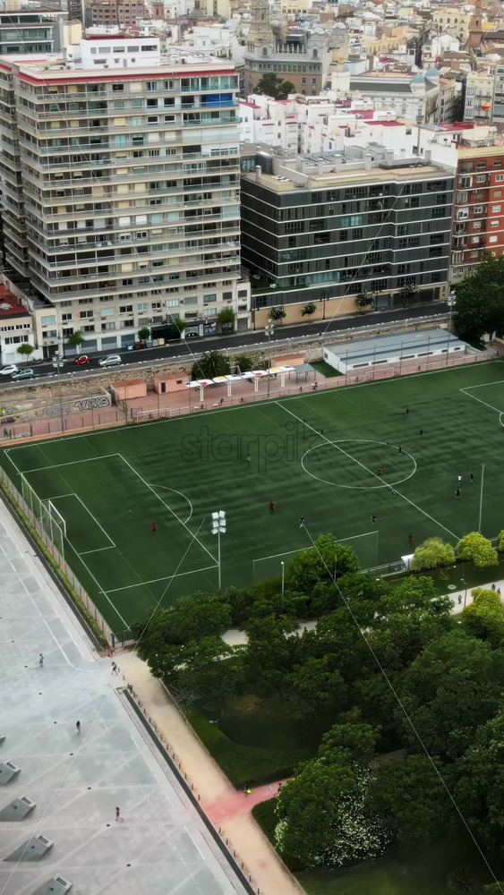 Cars and public transportation moving on the Exhibition Bridge near the Mestalla Stadium, and the Turia Gardens Park in Valencia, Spain. Vertical Royalty Free Stock Video Footage