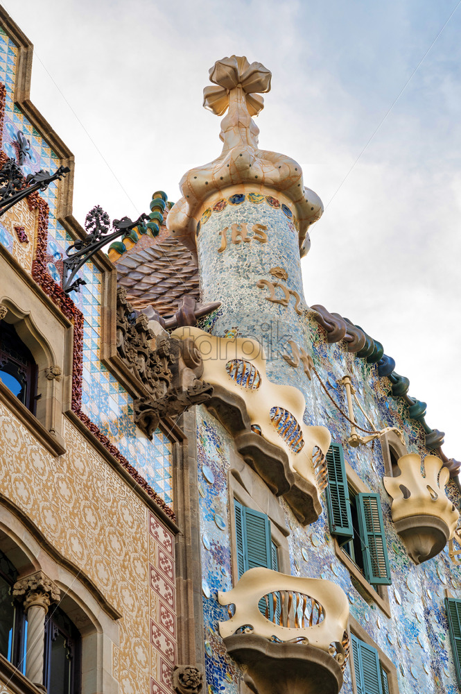 BARCELONA, SPAIN – NOVEMBER 10, 2016: Architecture, detail facade building Casa Sayrach, modernist building by Manuel Sayrach. Eixample district at sunset