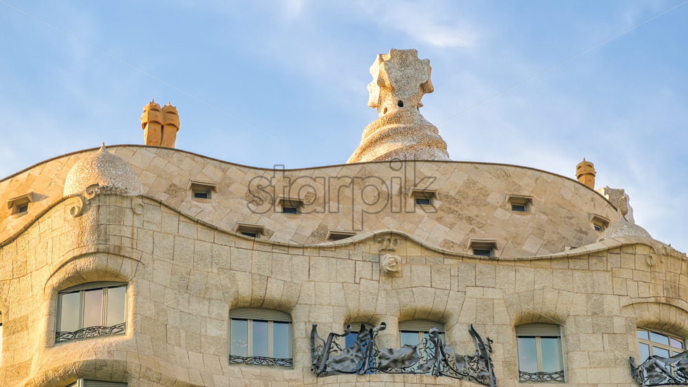 Top floors and roof of Casa Mila made by Antoni Gaudi at sunset in Barcelona, Spain