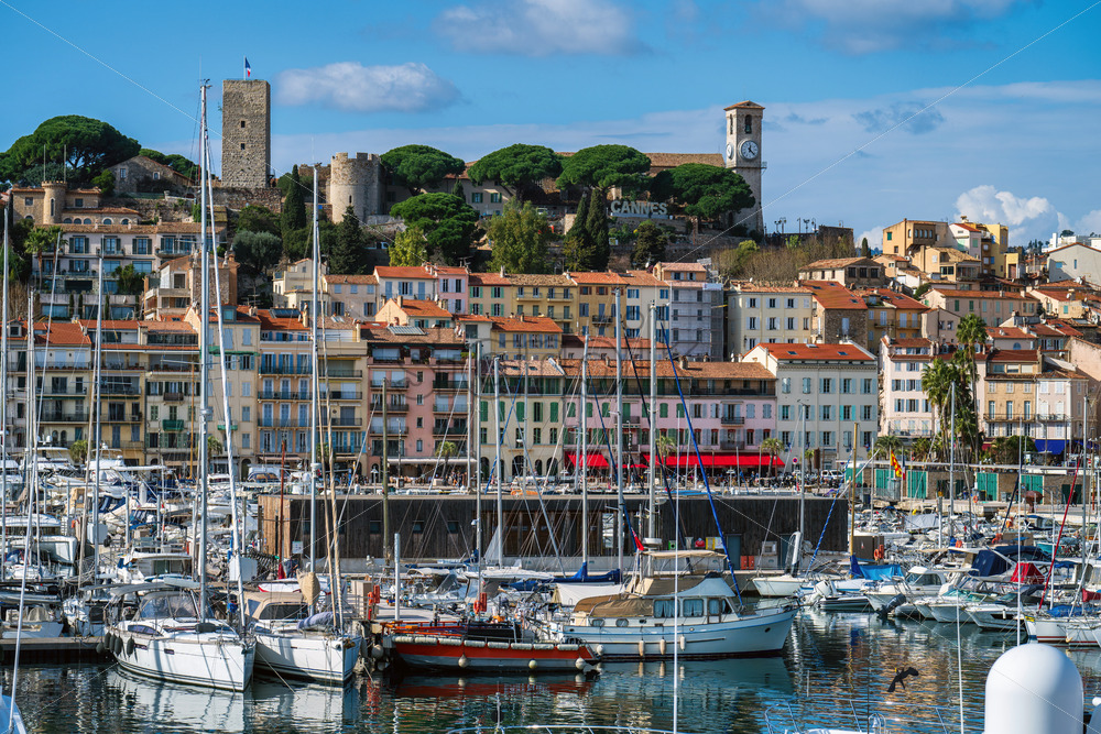 Aerial drone view of Cannes Old Port and the medieval Suquet quarter, with yachts docked in the marina and the Church of Our Lady of Esperance beautifully illuminated Royalty Free Stock Video Footage