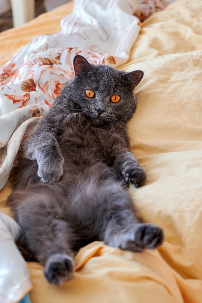 Home » Shop » photo » Cat with grey fur and orange eyes lying on the back