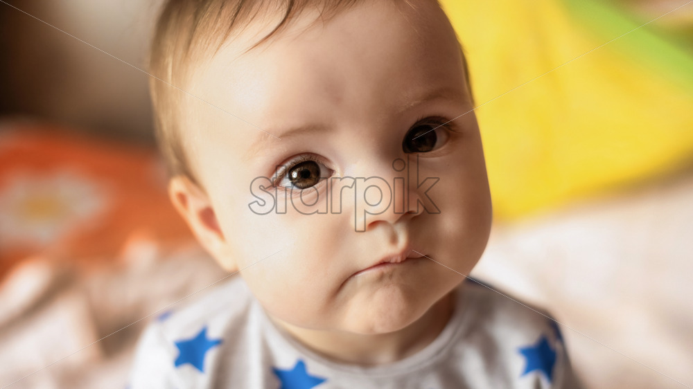 Caucasian blonde baby boy with brown eyes looking into the camera