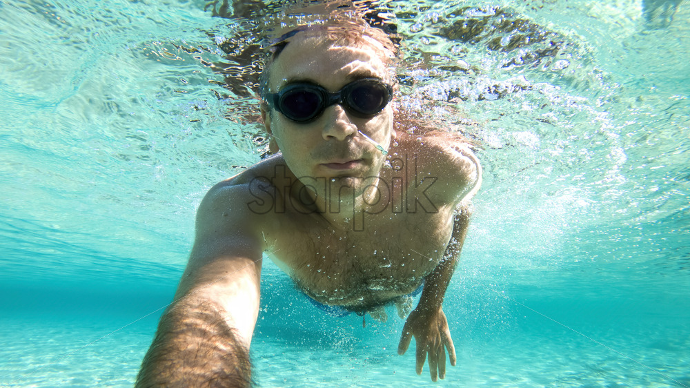 Caucasian man swimming under the water in swimming goggles holding a camera, blue transparent water