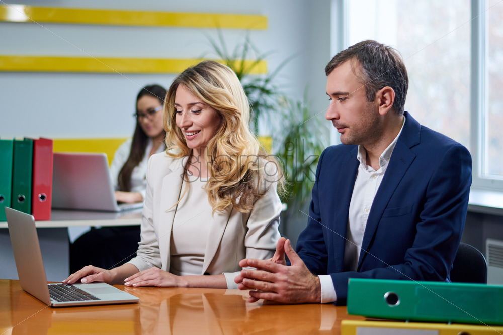 Home » Shop » photo » Caucasian mature man and woman at meeting table discussing a business plan with laptop computer in office. Workers on background