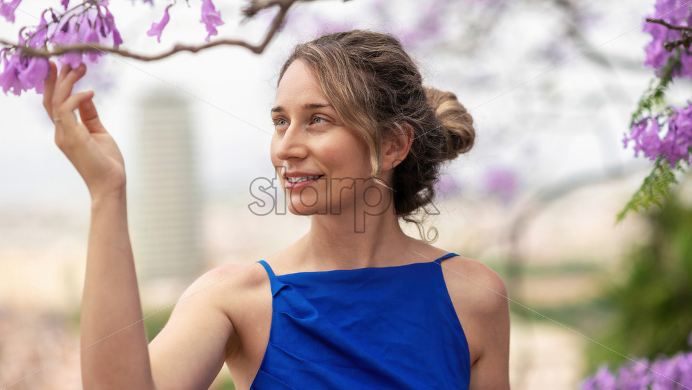Caucasian woman in blue dress touching pink tree flowers in Barcelona, Spain