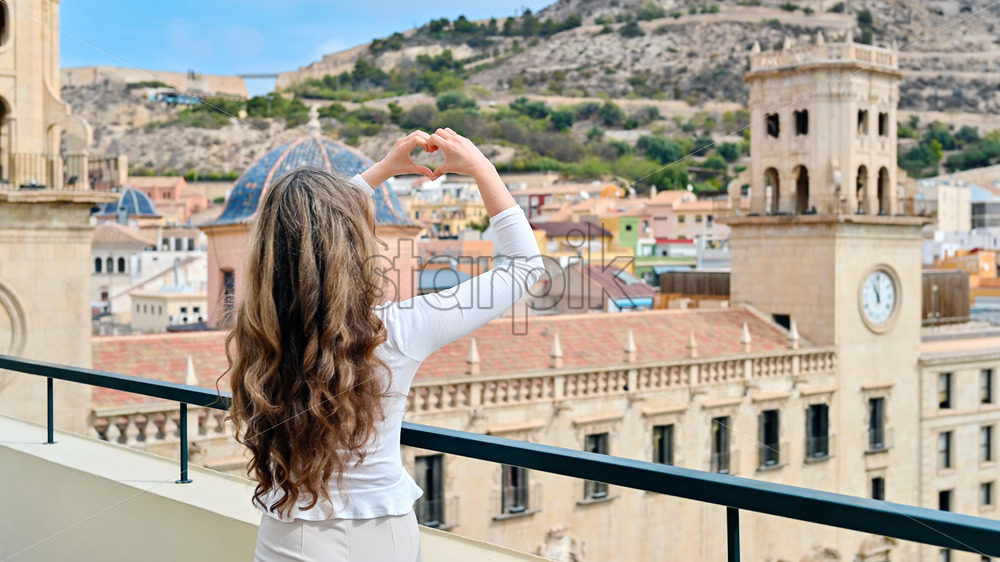 Caucasian woman making a heart shaped gesture near Town Hall. Mount Benacantil in the background