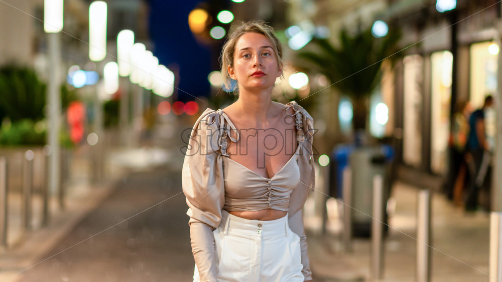 Caucasian smiling woman posing in Cannes at night, illumination, France