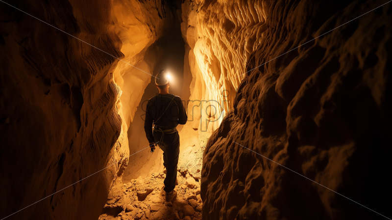 With a headlamp casting light, a person navigates narrow passages in rugged caverns, where shadows create an atmosphere of adventure and discovery underground.