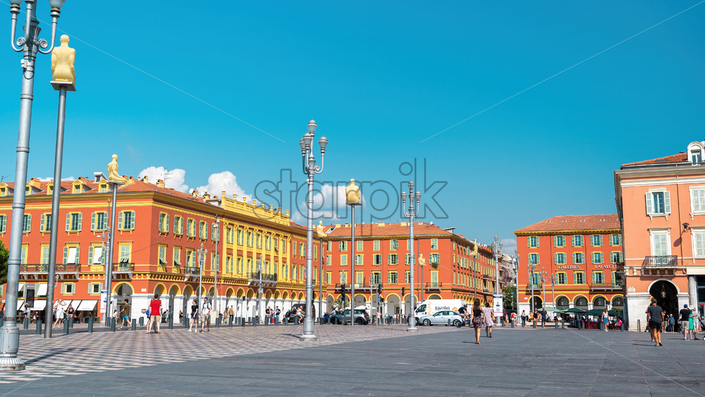 NICE, FRANCE – AUGUST 8, 2021: Central square with multiple people, classic buildings at sunny day
