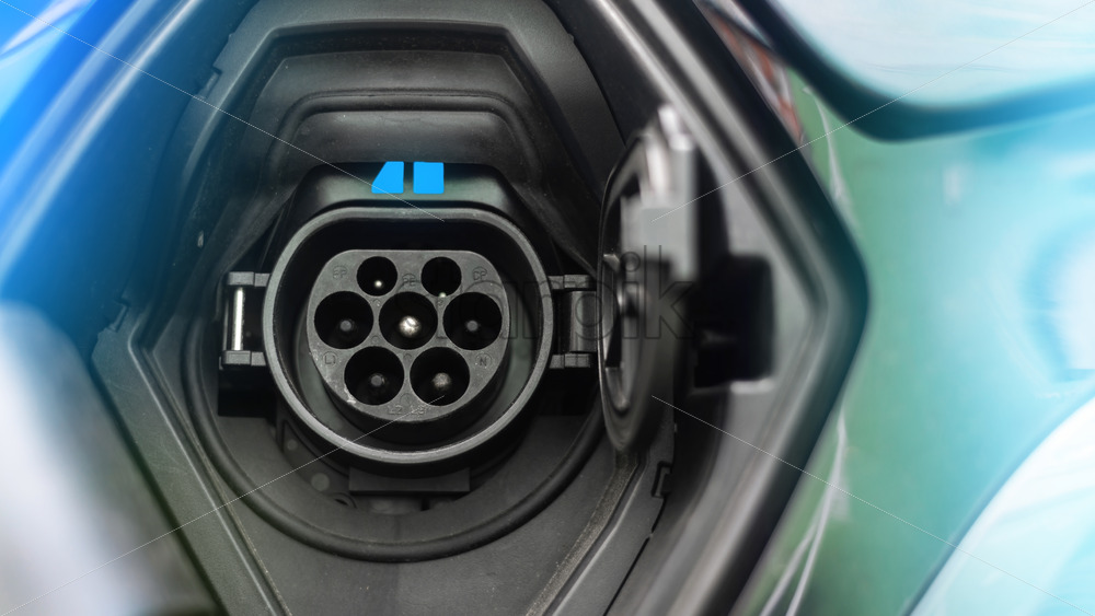 Man plugging in charger into an electric car, blue flickering light in the socket. Slow motion Royalty Free Stock Video Footage