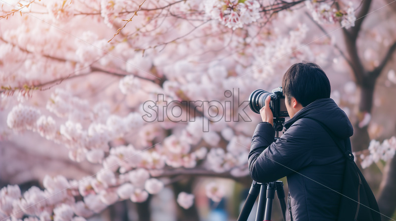 A dedicated photographer in Kyoto, Japan, capturing the mesmerizing cherry blossoms (sakura) in full bloom.
