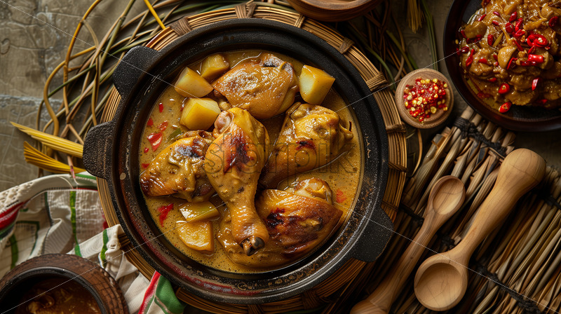 Gabonese Nyembwe Chicken, a traditional dish made with chicken cooked in palm nut sauce, often served with plantains or cassava