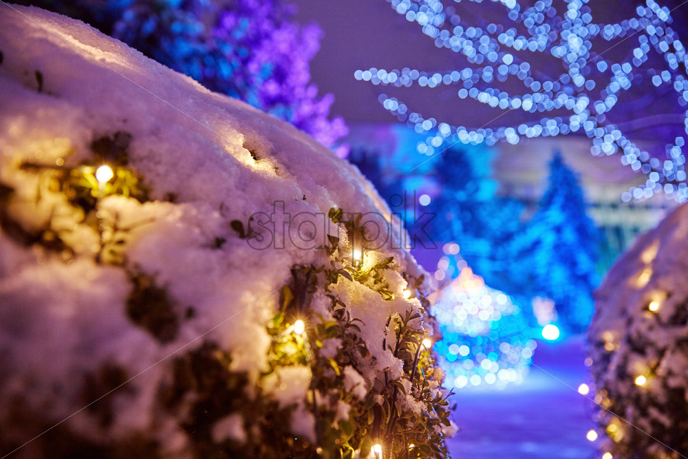 Aerial drone view of Chisinau city center covered in snow at night. The Triumphal Arch surrounded by Christmas winter decorations. Moldova Royalty Free Stock Video Footage