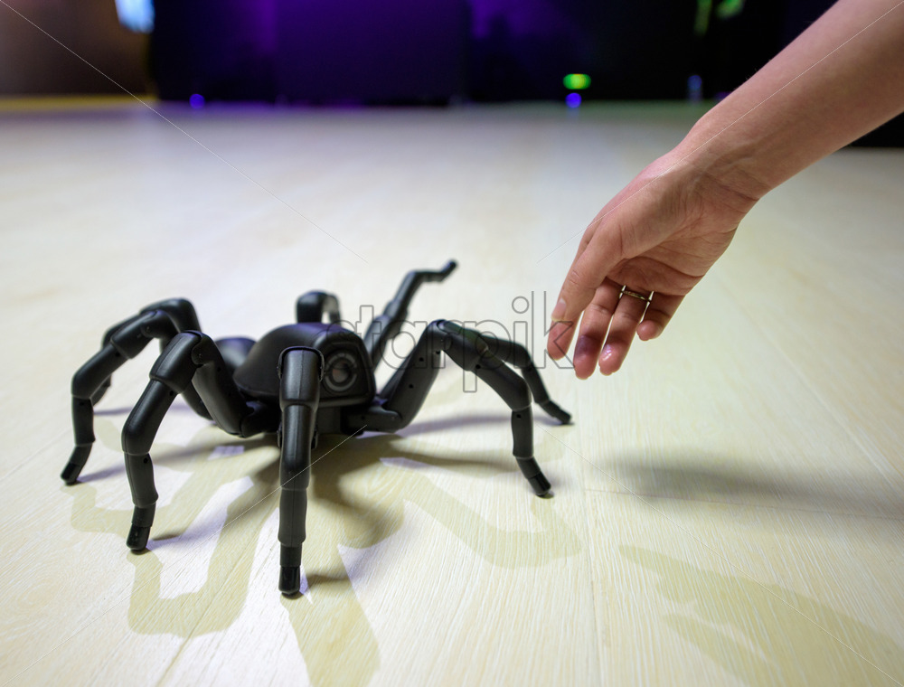 Home » Shop » buildings » CHISINAU, MOLDOVA-5 MARCH, 2019: exhibition of robots and engineering creations, black robot spider goes to the floor