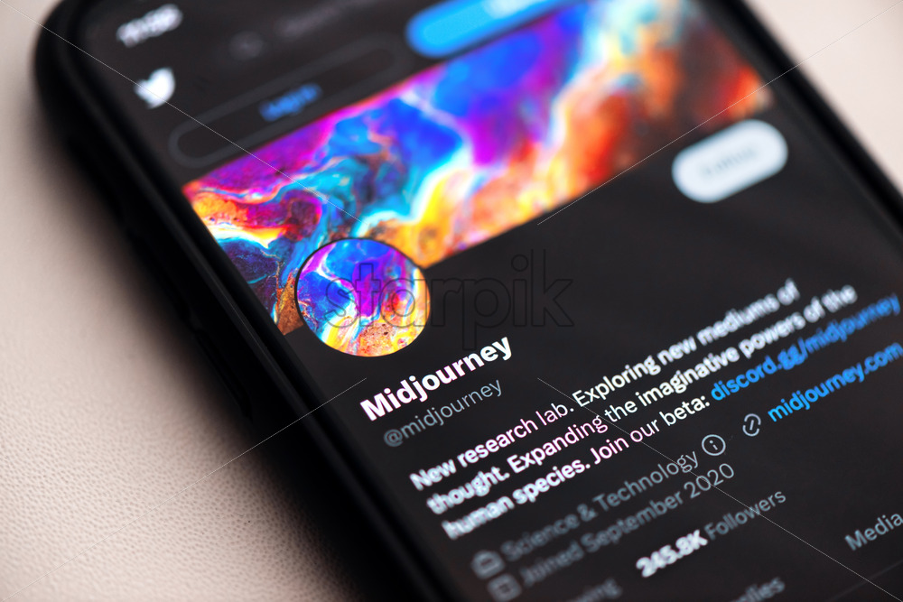 CHISINAU, MOLDOVA – APRIL, 2023: Close view of Midjourney AI Chat Bot account in Twitter