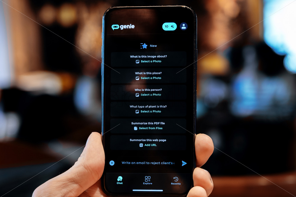 CHISINAU, MOLDOVA – APRIL, 2023: Man holding a phone with opened Genie – chat bot powered with AI