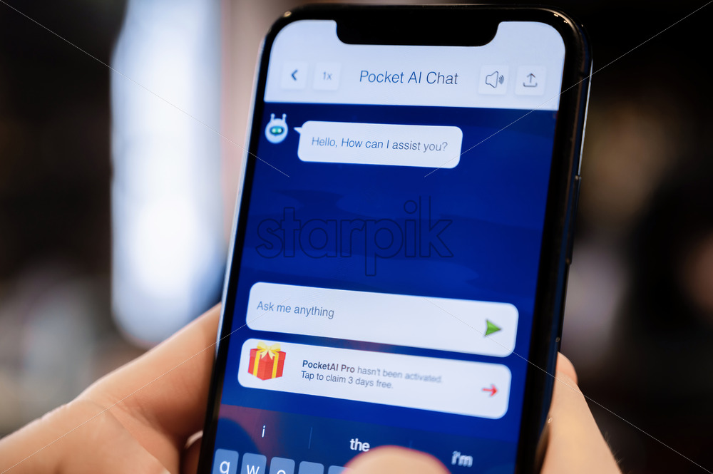 CHISINAU, MOLDOVA – APRIL, 2023: Man holding phone and talking with Pocket AI Chat