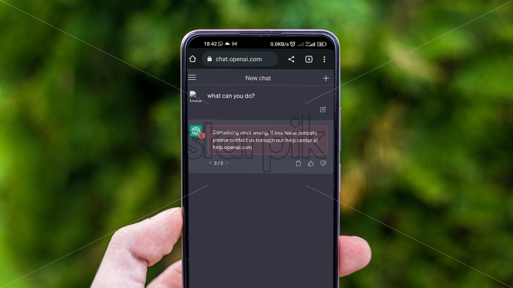 CHISINAU, MOLDOVA – APRIL, 2023: Opened AI ChatGPT on a smartphone with error in the chat. Greenery on the background
