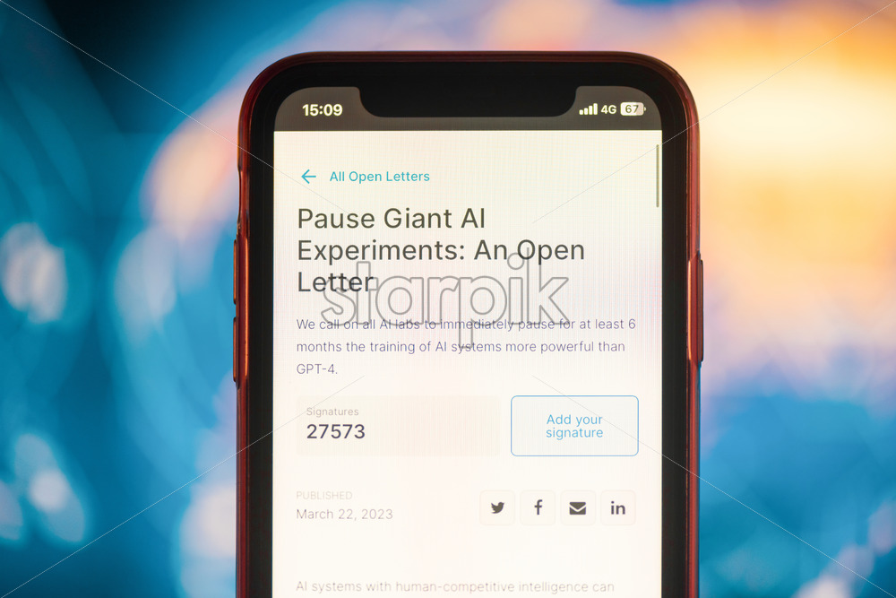 CHISINAU, MOLDOVA – APRIL, 2023: Smartphone with opened petition to stop the development of AI systems more powerful than GPT-4