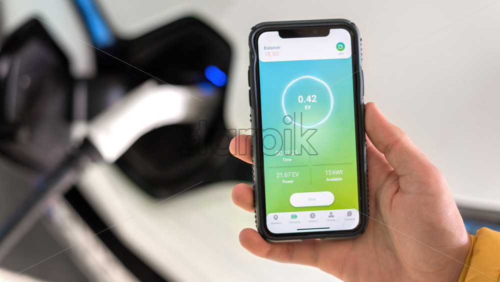 Home » Shop » photo » CHISINAU, MOLDOVA – APRIL 26, 2021: Man charging electro car, holding smartphone with charging process status