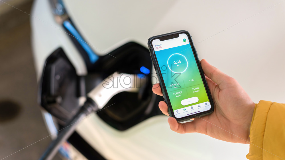 Home » Shop » photo » CHISINAU, MOLDOVA – APRIL 26, 2021: Man charging electro car, holding smartphone with charging process status