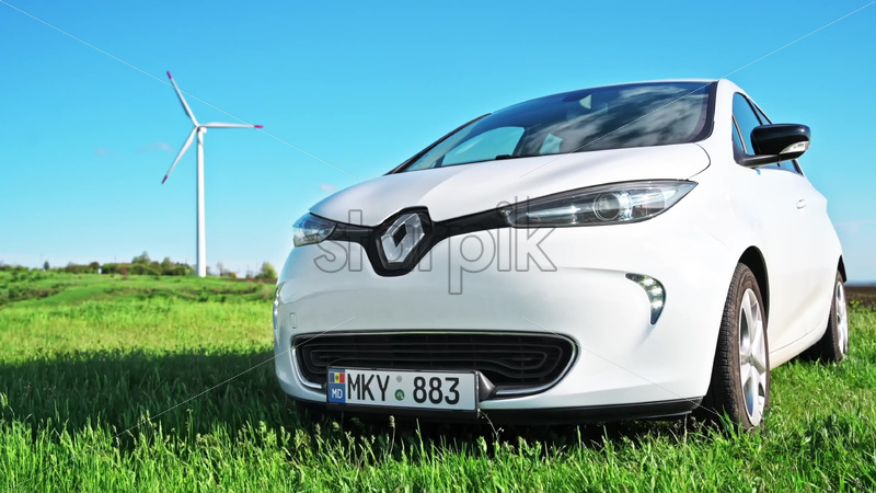 CHISINAU, MOLDOVA – APRIL 26, 2021: Renault Zoe electric car and electric wind mill eolian working, green field Royalty Free Stock Video Footage