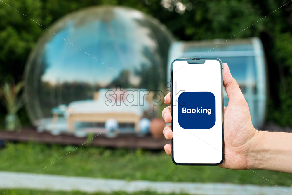 Home » Shop » photo » CHISINAU, MOLDOVA – AUGUST 11, 2023: Man holding a smartphone with glamping booking page with tent and forest on the background