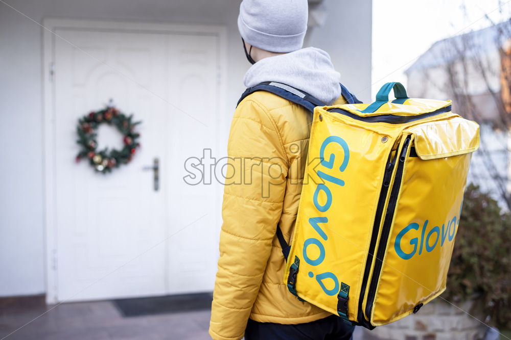 Home » Shop » photo » CHISINAU, MOLDOVA – DECEMBER 29, 2020: Glovo delivery man at winter with yellow backpack, client’s home on the background