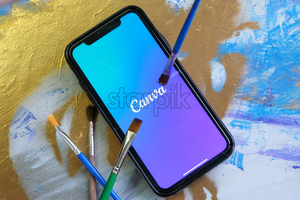 CHISINAU, MOLDOVA – FEBRUARY, 2022 : The logo of the garphic-design app Canva on a phone screen painted by brushes on a blue-golden background.