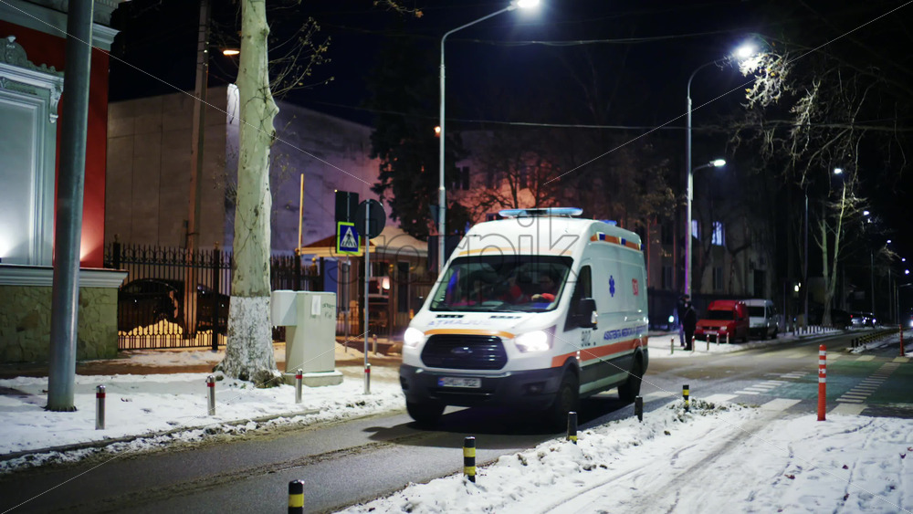 Chisinau, Moldova – January 20, 2026: Urban street at night in winter with ambulance vehicle lights flashing near a building