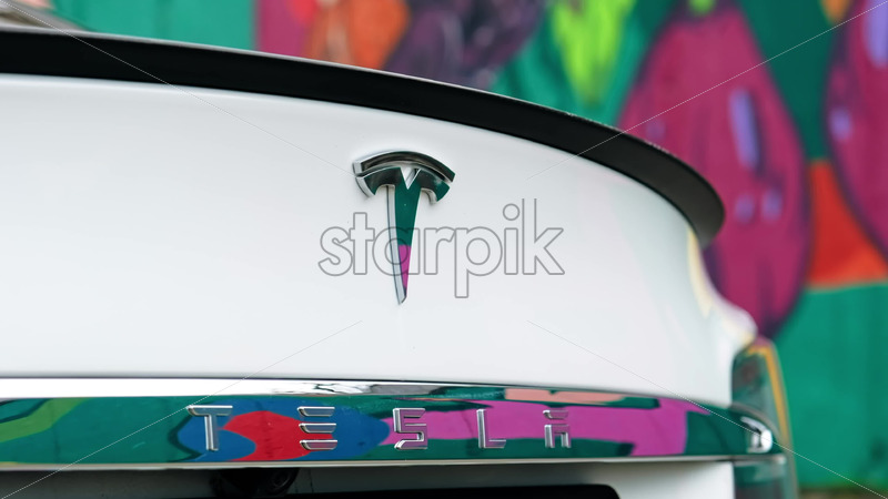 CHISINAU, MOLDOVA – JANUARY, 2022: Close view of Tesla Model S P90 logo, rear view