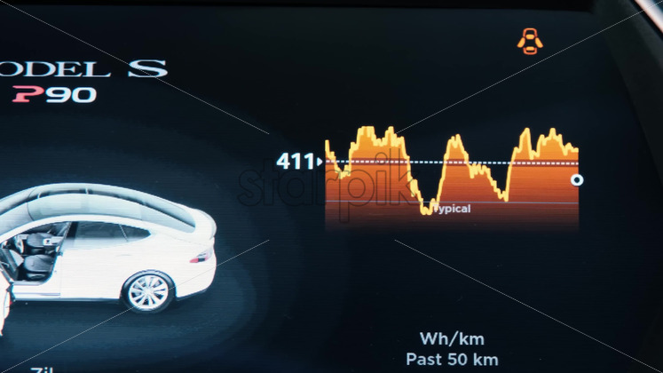 CHISINAU, MOLDOVA – JANUARY, 2022: Tesla Model S P90 interior. Display showing consumption information Royalty Free Stock Video Footage