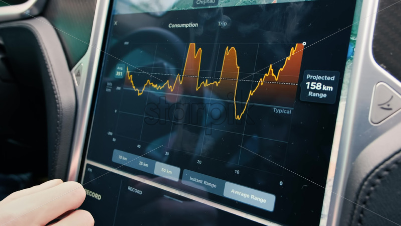 Chisinau, Moldova – January 23, 2024: Tesla Model 3 energy consumption graph on the touch screen inside the red electric car. Dark theme Royalty Free Stock Video Footage