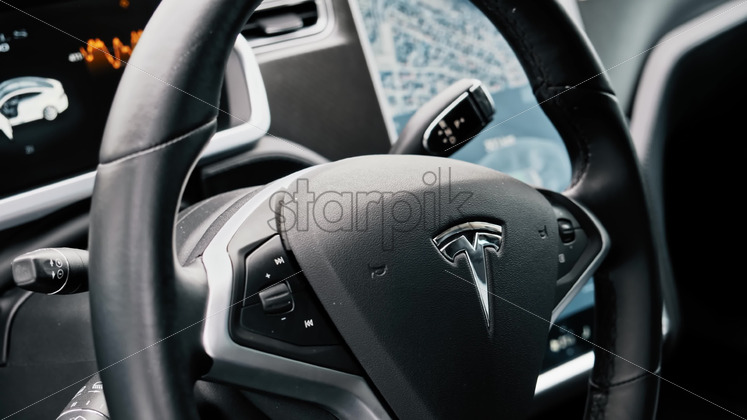 CHISINAU, MOLDOVA – JANUARY, 2022: Tesla Model S P90 interior. Steering wheel and displays showing information Royalty Free Stock Video Footage