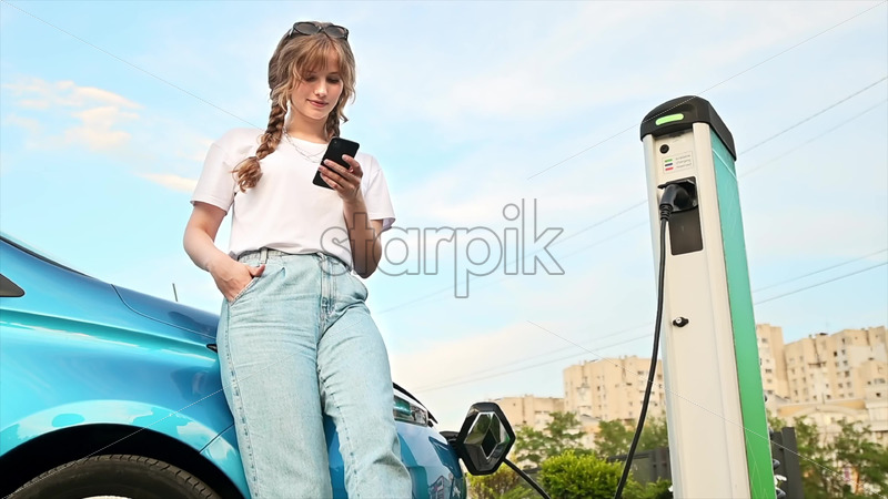 Home » Shop » city » Video – CHISINAU, MOLDOVA – JULY, 2022: A young blonde woman putting a charger into a car charging station, electric Renault ZOE nearby. Slow motion