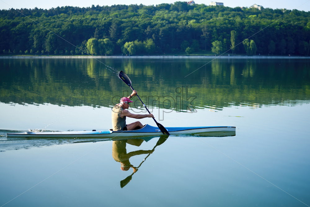 Home » Shop » photo » CHISINAU, MOLDOVA – JUNE 12, 2020: Man rowing in a kayak on a lake with green trees on the background