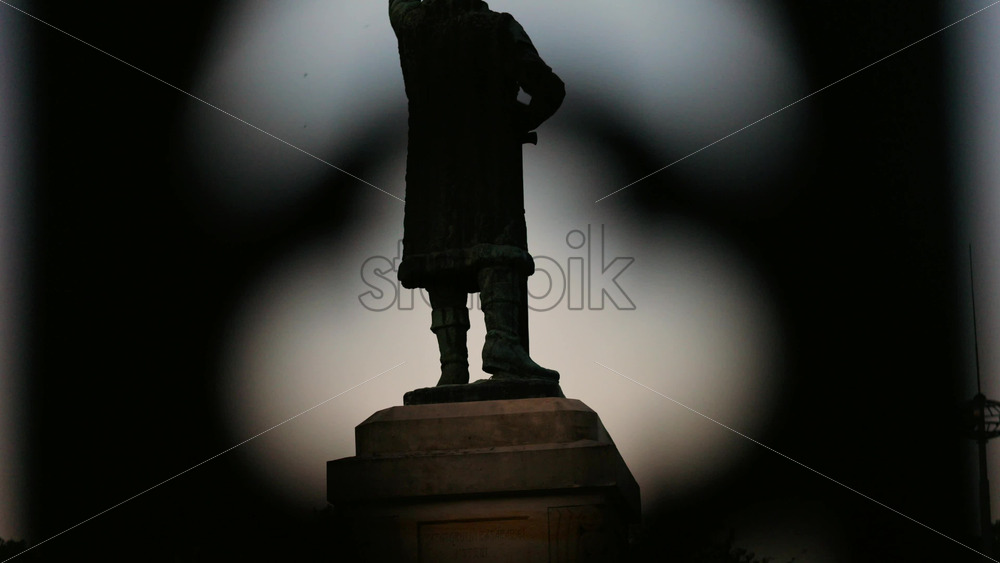 Chisinau, Moldova – June 15, 2025: Stephen the Great statue seen through the out-of-focus curves of a wrought-iron fence. Vertical Royalty Free Stock Video Footage