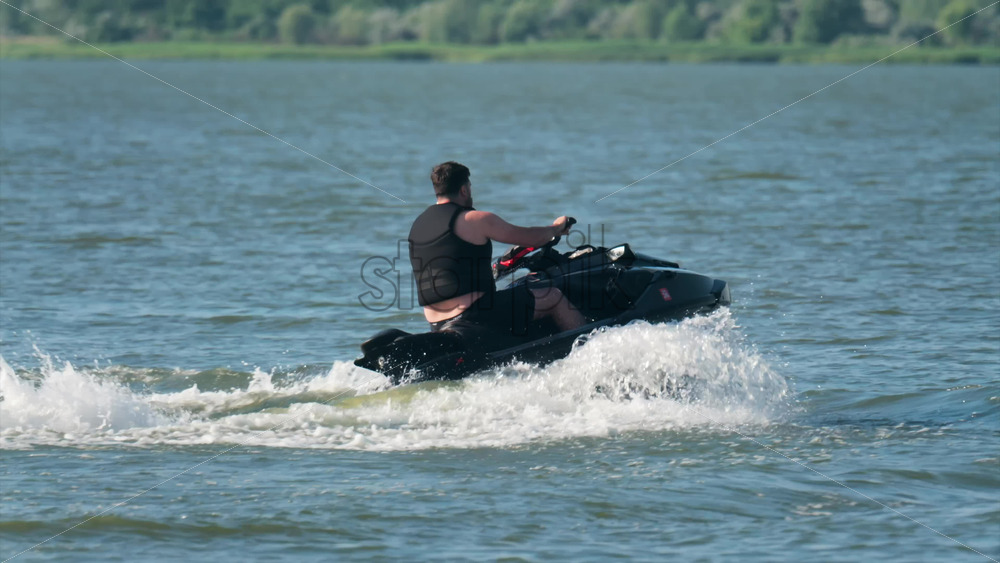 Home » Shop » 1 Video » Video – Chisinau, Moldova – June 17, 2025: A man in a black life vest riding a black jet ski at high speed across a calm body of water