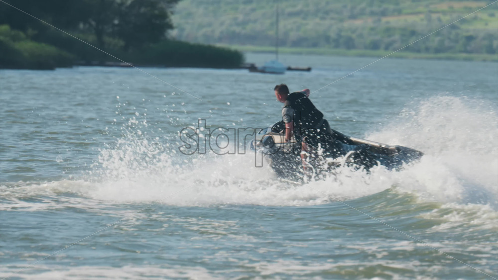Chisinau, Moldova – June 17, 2025: A man in a black life vest riding a black jet ski at high speed across a calm body of water Royalty Free Stock Video Footage