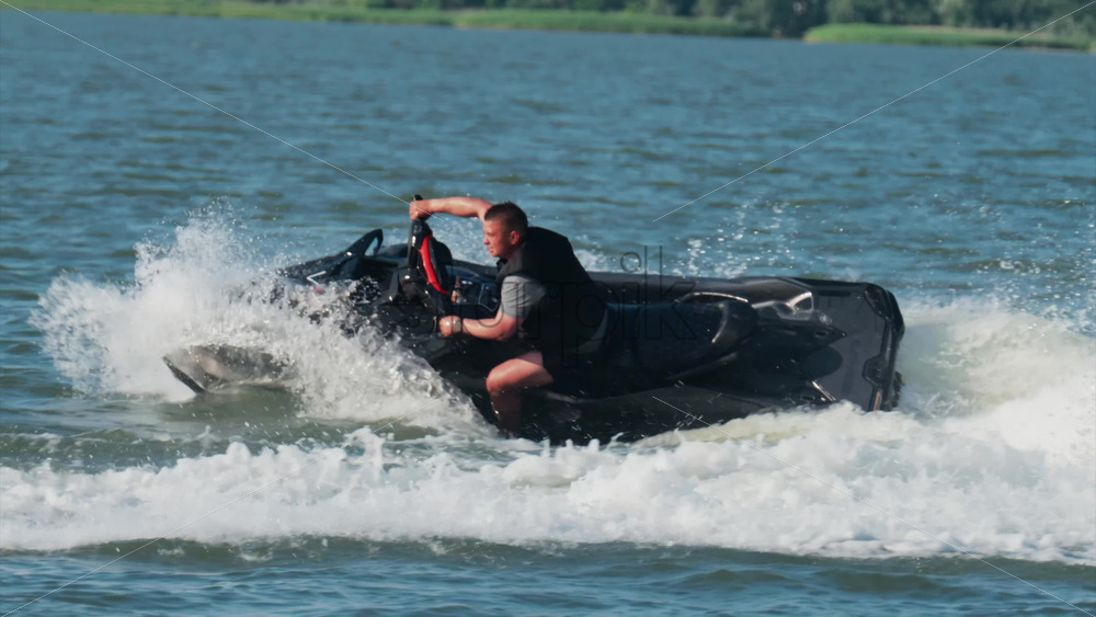 Home » Shop » 1 Video » Video – Chisinau, Moldova – June 17, 2025: A man in a black life vest riding a black jet ski at high speed across a calm body of water