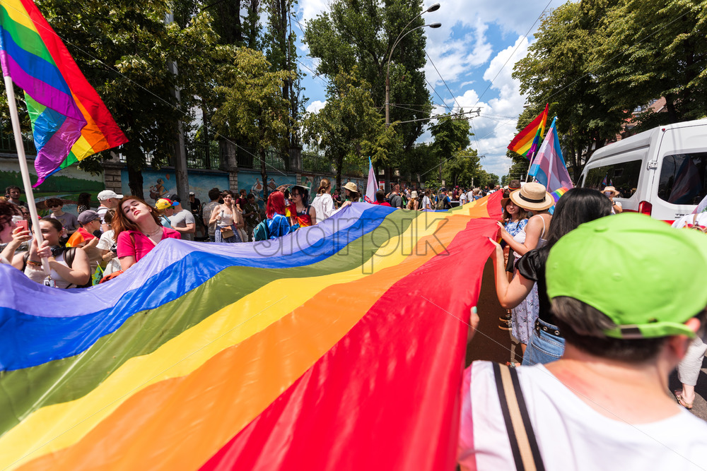 Home » Shop » photo » CHISINAU, MOLDOVA – JUNE 19, 2023 : Pride parade in center of the city. People with rainbow flag