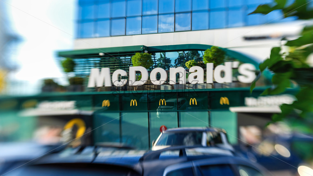 CHISINAU, MOLDOVA – JUNE 9, 2021: McDonald’s with parked cars in front of it. Lensbaby artistic blur