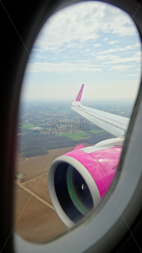 Chisinau, Moldova – March 20, 2025: View of the turbine and wing of a WizzAir airplane from the window. Vertical Royalty Free Stock Video Footage