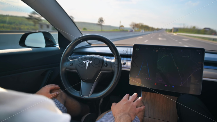 Home » Shop » technology » Video – CHISINAU, MOLDOVA – MAY, 2023: Interior view of a Tesla Model 3 moving on autopilot on a highway. Driver periodically touching the steering wheel