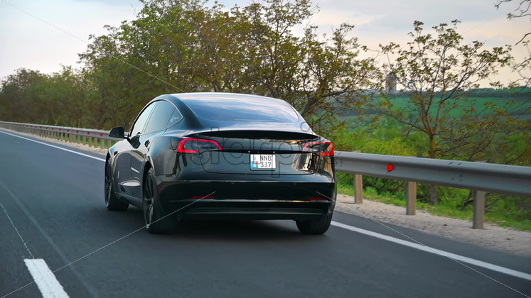 CHISINAU, MOLDOVA – MAY, 2023: Rear view of a moving black Tesla Model 3 on a highway. Nature on the background. Slow motion Royalty Free Stock Video Footage