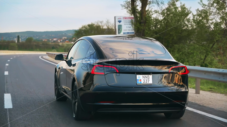 CHISINAU, MOLDOVA – MAY, 2023: Rear view of a moving black Tesla Model 3 on a highway. Nature on the background. Slow motion Royalty Free Stock Video Footage