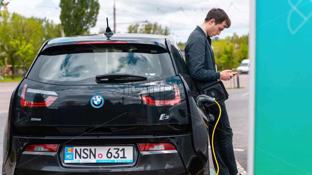 CHISINAU, MOLDOVA – MAY 9, 2021: Man charging an electric BMW i3 at charge station and using smartphone
