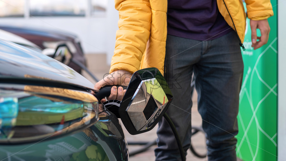 CHISINAU, MOLDOVA – MAY 9, 2021: Man plugging in charger into Renault ZOE at charge station