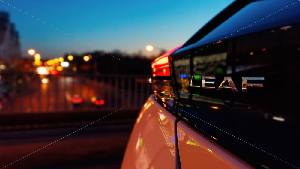 CHISINAU, MOLDOVA – NOVEMBER 12, 2021: Electric Nissan Leaf logo, rear view, sunset